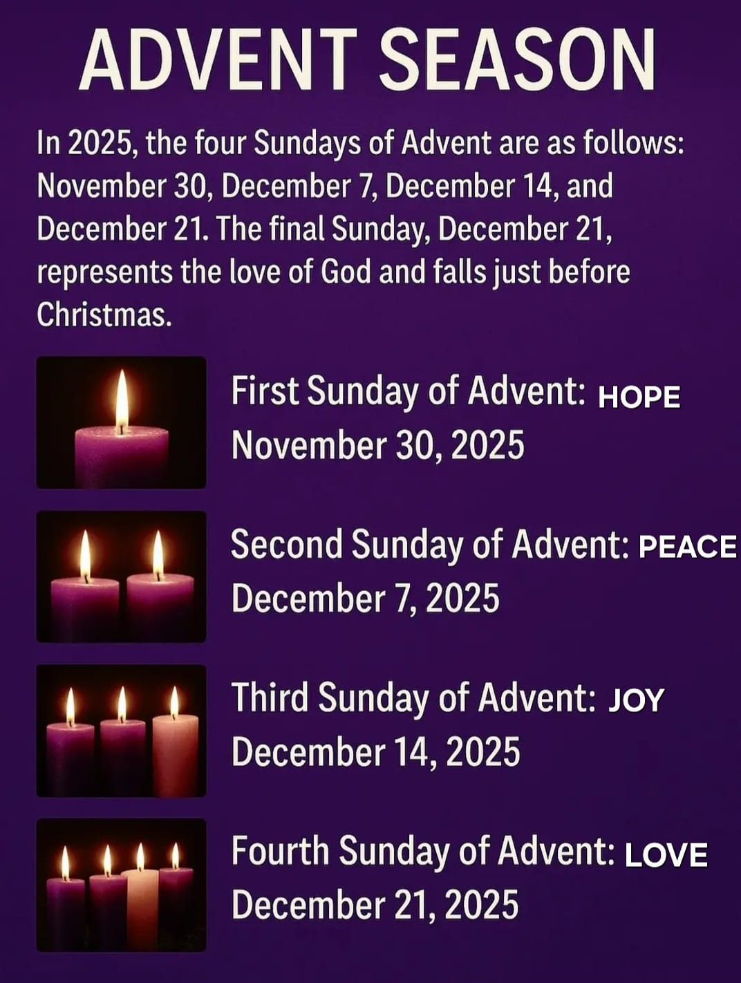 Happy New Year! Today, November 30, 2025 is the First Sunday of Advent. While a month yet remains in the civil year, the Church is celebrating the beginning of a new Liturgical year. Advent is the time of year we prepare and celebrate the arrival of Christ on earth and His salvation for mankind. There are two main focus of the season. The first is the preparation to celebrate the first coming of Christ in history. That first coming of Christ was His birth. We prepare with joy to celebrate the birthday of our Savior on December 25th. The second focus of the season is the Second coming of Jesus at the end of the time. Jesus promised to come back. Advent is a kind of wake-up call to us for the second coming of Christ. Advent from the Latin word ad venio, means “to come”. It is the liturgical season anticipating the Adventus Domini, that is the “coming of the Lord.” While the days grow shorter and colder, we prepare for the “Sun of Justice” who comes to kindle our hearts with His light and his love.