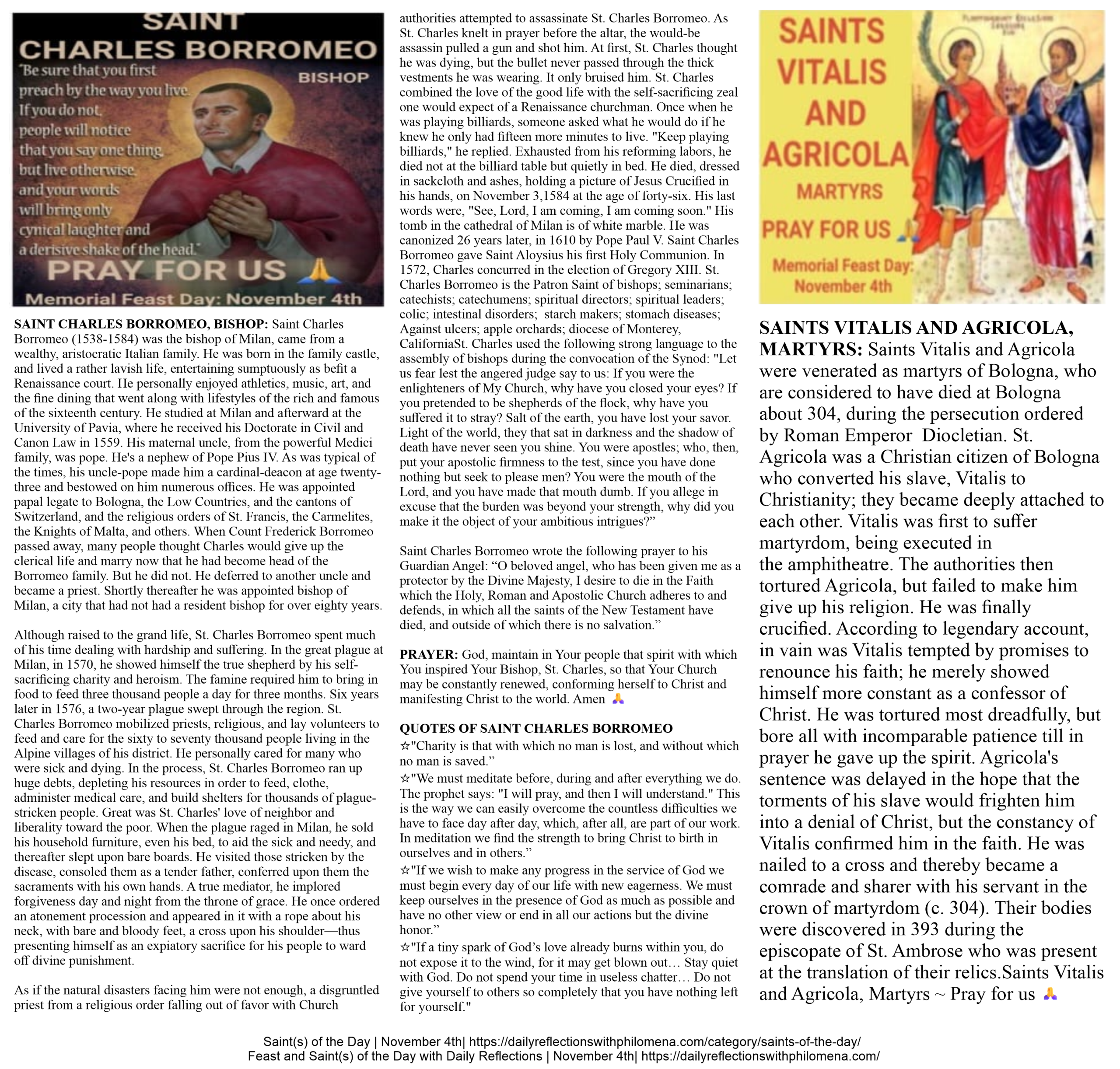 MEMORIAL OF SAINT CHARLES BORROMEO, BISHOP AND SAINTS VITALIS AND AGRICOLA, MARTYRS – FEAST DAY ~ NOVEMBER 4TH: Today, we celebrate the Memorial of Saint Charles...