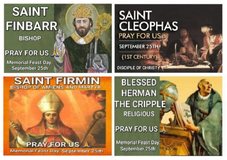 MEMORIAL OF SAINT FINBARR, BISHOP: SAINT CLEOPHAS, DISCIPLE OF CHRIST; SAINT FIRMIN, BISHOP OF AMIENS AND MARTYR AND BLESSED HERMAN THE CRIPPLE, RELIGIOUS: Today, we celebrate...