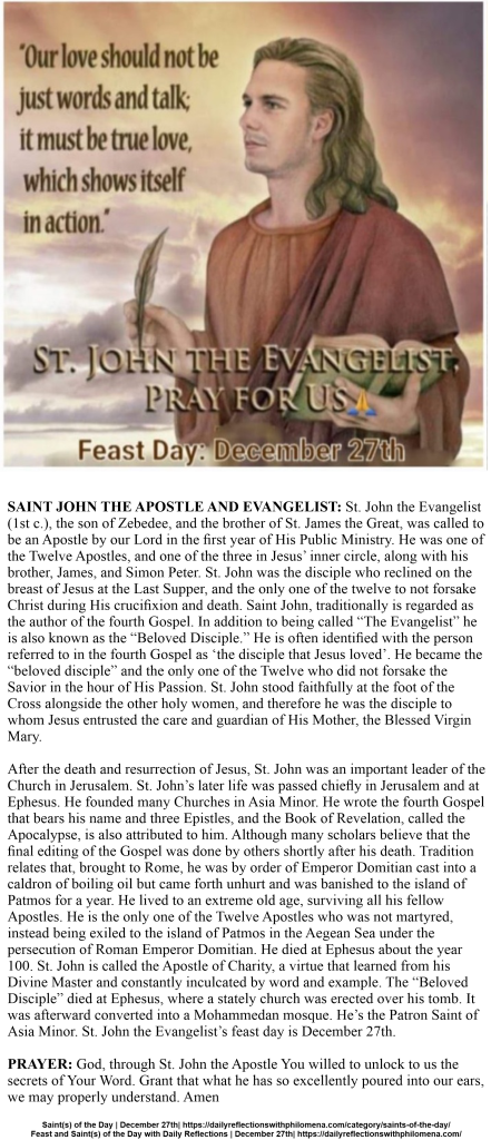 SAINTS OF THE DAY ~ FEAST DAY: DECEMBER 27, 2025 | https://dailyreflectionswithphilomena.com/category/saints-of-the-day