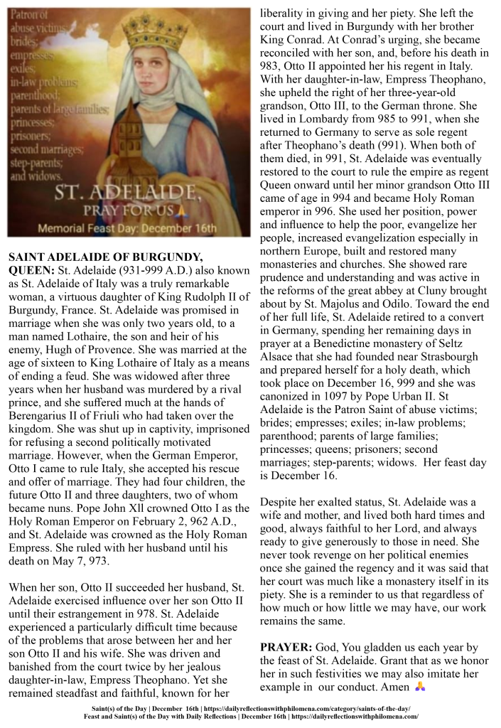(Direct link to the detailed history of Saint Adelaide of Burgundy | https://dailyreflectionswithphilomena.com/saint-of-the-day-feast-day-december-16th/)