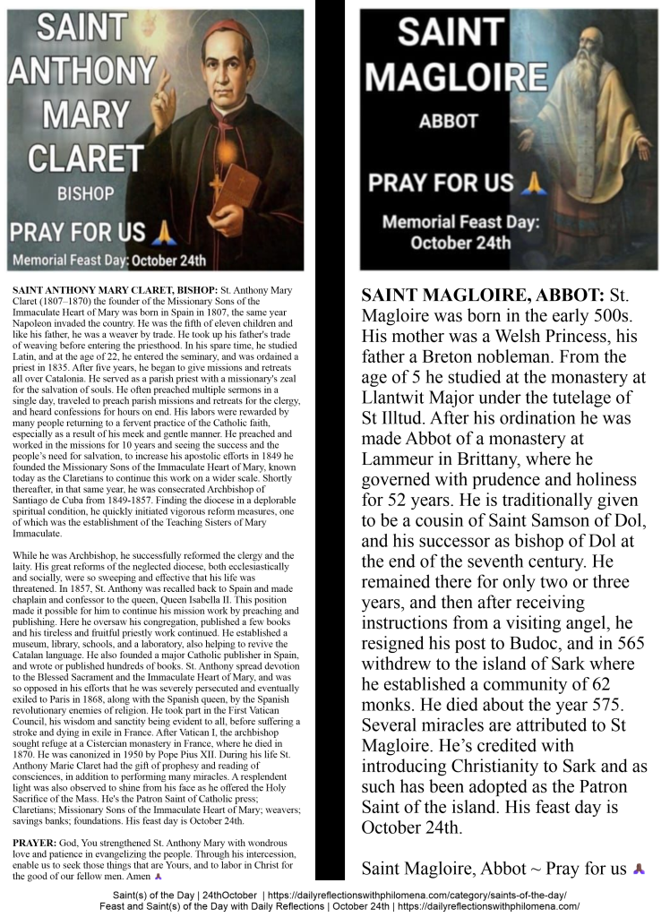 (Direct link to the detailed history of Saint Anthony Mary Claret and Saint Magloire | https://dailyreflectionswithphilomena.com/saints-of-the-day-feast-day-october-24th/)