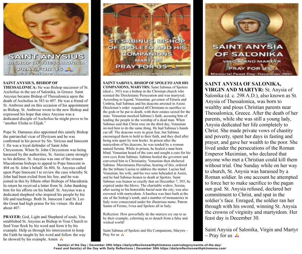 MEMORIAL OF SAINT ANYSIUS, BISHOP OF THESSALONICA; SAINT SABINUS, BISHOP OF SPOLETO AND HIS COMPANIONS, MARYTRS AND SAINT ANYSIA OF SALONIKA, VIRGIN AND MARTYR | DECEMBER 30TH | Direct link to the detailed history of Saint Anysius, Saint Sabinus and his Companions, and Saint Anysia of Salonika | https://dailyreflectionswithphilomena.com/saints-of-the-day-feast-day-december-30th/