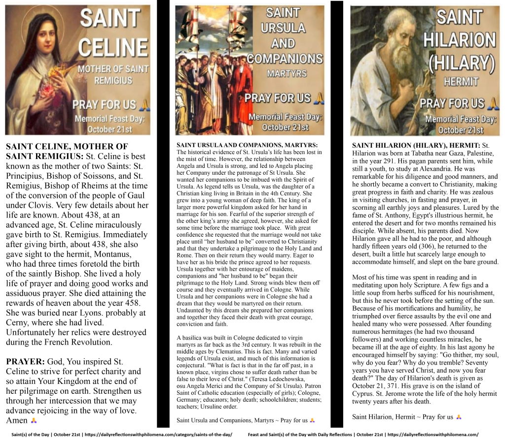 (Direct link to the detailed history of Saint Celine, Saint Ursula and Companions, and Saint Hilarion | https://dailyreflectionswithphilomena.com/saints-of-the-day-feast-day-october-21st/)