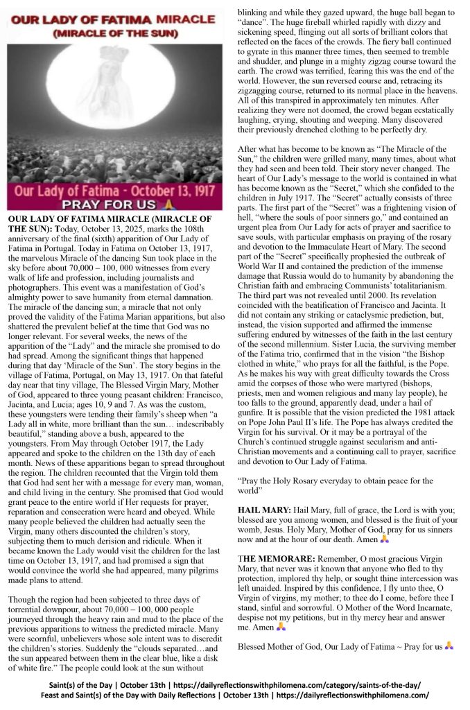 OUR LADY OF FATIMA MIRACLE (MIRACLE OF THE SUN): SIXTH APPARITION OF OUR LADY | MEMORIAL OF SAINT EDWARD THE CONFESSOR, KING OF ENGLAND; SAINT GERALD OF AURILLAC; AND SAINT LUBENTIUS, PRIEST ~ FEAST DAY: OCTOBER 13TH: Today, we joyfully commemorate the 108th Anniversary of the Miracle of the Sun, the sixth and final apparition of Our Lady of Fatima in Portugal (October 13, 1917). We also honor the holy memories of Saint Edward the Confessor, King of England (Patron of difficult marriages and separated spouses), Saint Gerald of Aurillac (Patron of counts, bachelors, and the physically challenged), and Saint Lubentius, Priest (Missionary of the Moselle region and disciple of Saint Martin of Tours). Through the powerful intercession of our Blessed Mother Mary and these holy saints, we lift our hearts in prayer for peace, unity, and holiness in the world. May God, who revealed His mercy through the signs at Fatima, pour out grace upon all who suffer and seek His love. We pray for those discerning marriage and for married couples facing trials, may they find reconciliation, love, and divine strength. We pray for widows and widowers, the sick and dying, especially those enduring cancer or terminal illness, and for the poor, needy, and forgotten. May the light of Christ shine upon the souls in Purgatory and all the faithful departed. We pray also for our Holy Father, Pope Leo XIV, the bishops, priests, and all consecrated men and women, that their ministry may bear fruit in faith and charity. May Our Lady of Fatima continue to intercede for the conversion of sinners and the triumph of her Immaculate Heart in every nation. Amen🙏🏾