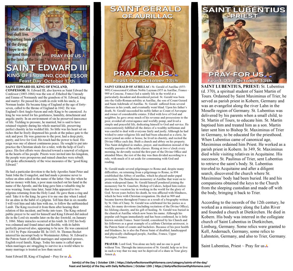 (Direct link to the detailed history of Our Lady of Fatima, Saint Edward the Confessor, Saint Gerald of Aurillac, and Saint Lubentius | https://dailyreflectionswithphilomena.com/saints-of-the-day-feast-day-october-13th/)