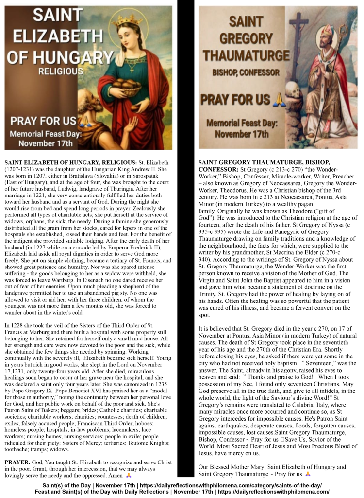 (Direct link to the detailed history of Saint Elizabeth of Hungary, and Saint Gregory Thaumaturge | https://dailyreflectionswithphilomena.com/saints-of-the-day-feast-day-november-17th/)