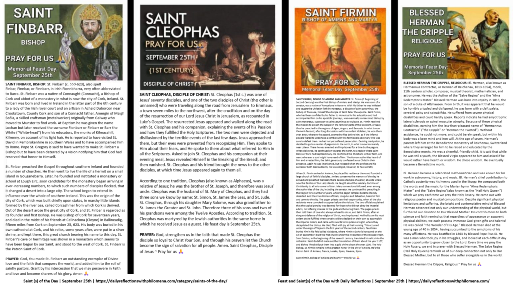 (Direct link to the detailed history of Saint Finbarr, Saint Cleophas, Saint Firmin, and Blessed Herman the Cripple | https://dailyreflectionswithphilomena.com/saints-of-the-day-feast-day-september-25th/)
