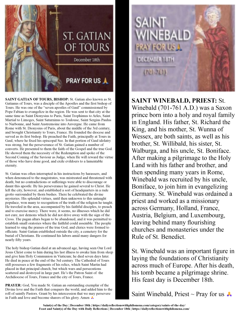 (Direct link to the detailed history of Saint Gatian of Tours, and Saint Winebald | https://dailyreflectionswithphilomena.com/saints-of-the-day-feast-day-december-18th/)