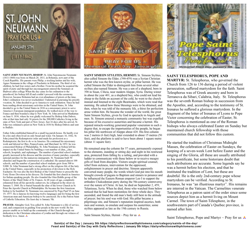 (Direct link to the detailed history of Saint John Neumann, Saint Simeon Stylites, and Saint Telesphorus | https://dailyreflectionswithphilomena.com/saints-of-the-day-feast-day-january-5th/)