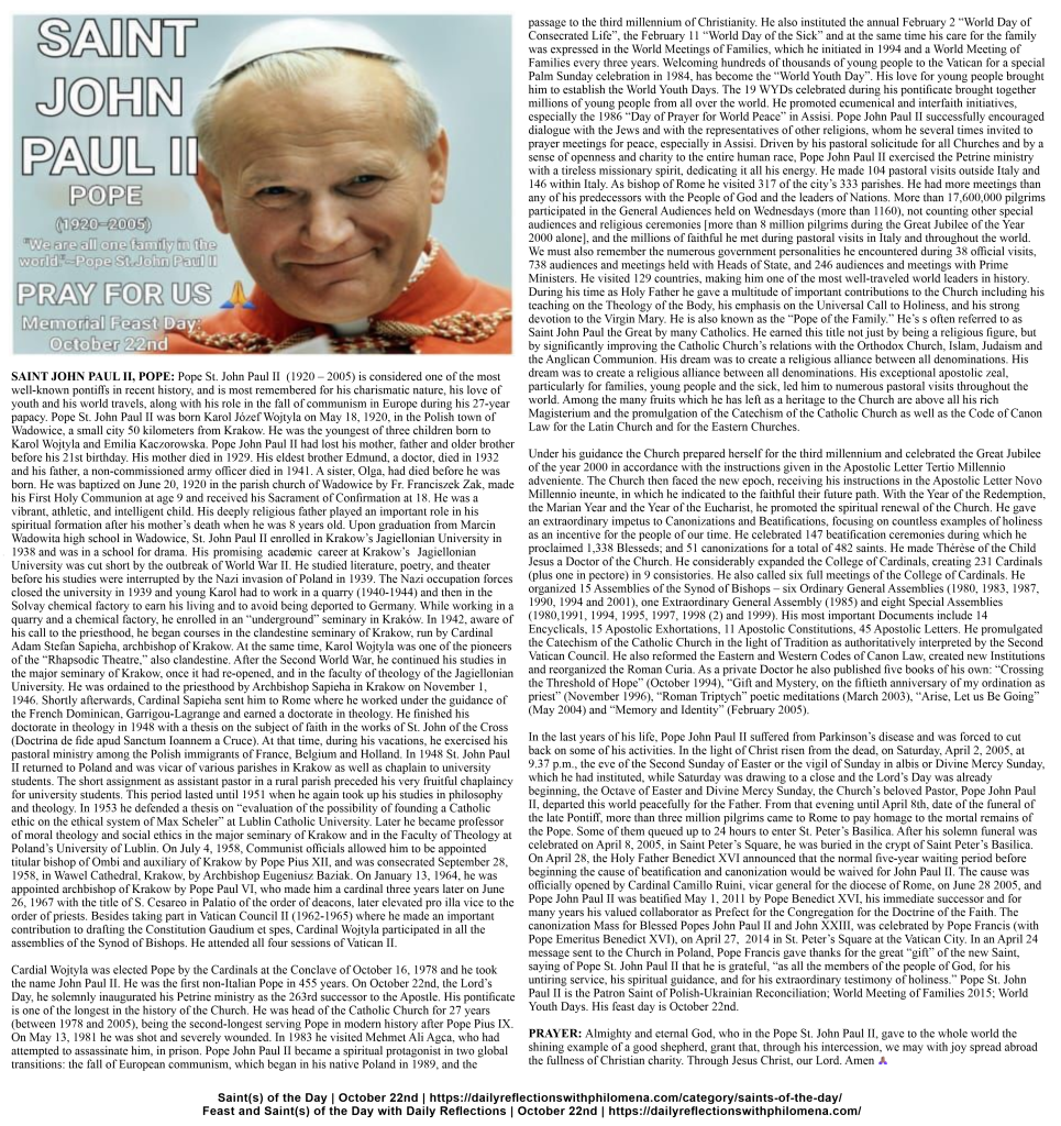 (Direct link to the detailed history of Saint John Paul II, Saint Mary Salome, and Saint Mello of Cardiff | https://dailyreflectionswithphilomena.com/saints-of-the-day-feast-day-october-22nd/)