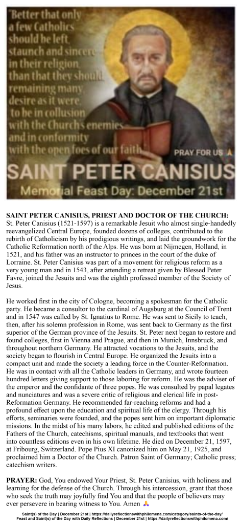 MEMORIAL OF SAINT PETER CANISIUS, PRIEST AND DOCTOR OF THE CHURCH | DECEMBER 21ST | Direct link to the detailed history of Saint Peter Canisius | https://dailyreflectionswithphilomena.com/saints-of-the-day-feast-day-december-21st/