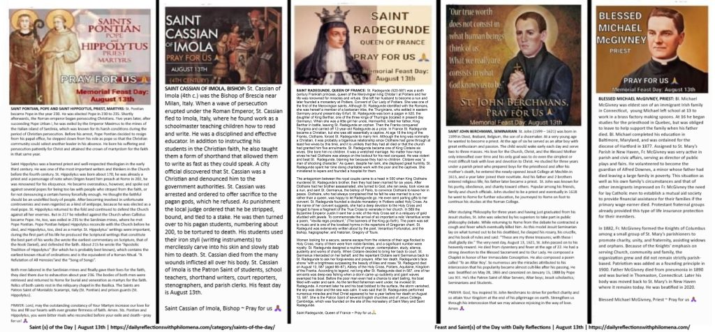(Direct link to the detailed history of Saints Pontian and Saint Hippolytus, Saint Cassian of Imola, Saint Radegunde, Saint John Berchmans, and Blessed Michael McGivney| https://dailyreflectionswithphilomena.com/saints-of-the-day-feast-day-august-13th/)
