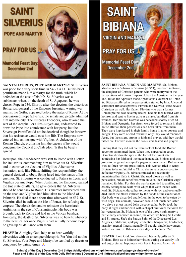 MEMORIAL OF SAINT SILVERIUS, POPE AND MARTYR AND SAINT BIBIANA, VIRGIN AND MARTYR | DECEMBER 2ND | Direct link to the detailed history of Saint Silverius, and Saint Bibiana | https://dailyreflectionswithphilomena.com/saints-of-the-day-feast-day-december-2nd/