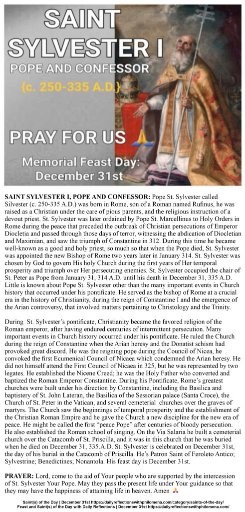 MEMORIAL OF SAINT SYLVESTER I, POPE AND CONFESSOR | DECEMBER 31ST| Direct link to the detailed history of Saint Sylvester I | https://dailyreflectionswithphilomena.com/saints-of-the-day-feast-day-december-31st/