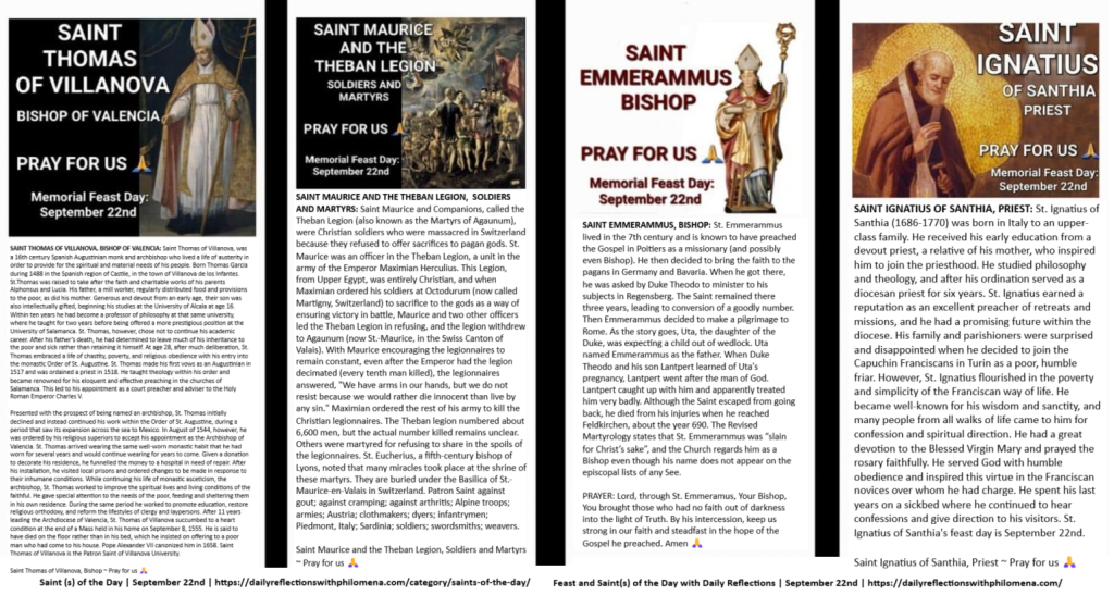 ( Direct link to the detailed history of Saint Thomas of Villanova, Saint Maurice and the Theban Legion, Saint Emmerammus, and Saint Ignatius of Santhia | https://dailyreflectionswithphilomena.com/saints-of-the-day-feast-day-september-22nd/ )