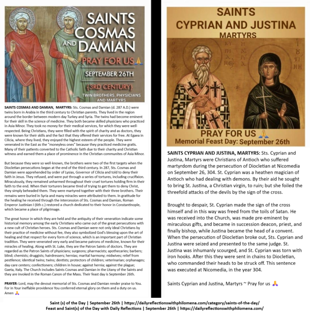 (Direct link to the detailed history of Saints Cosmas & Damian, and Saints Cyprian & Justina | https://dailyreflectionswithphilomena.com/saints-of-the-day-feast-day-september-26th/)
