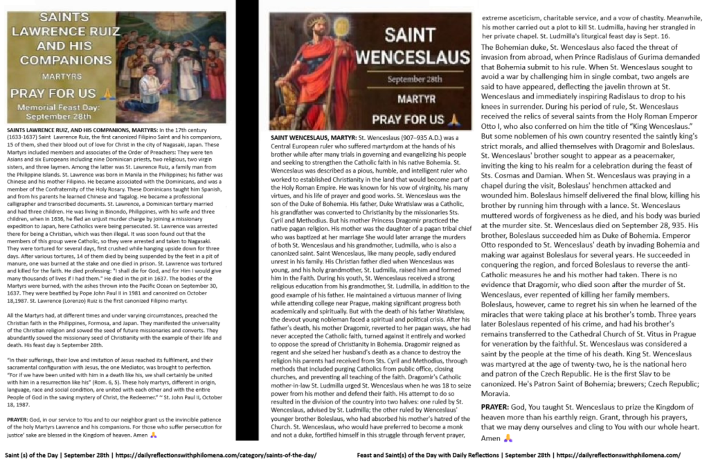 MEMORIAL OF SAINTS LAWRENCE RUIZ, AND HIS COMPANIONS, MARTYRS; SAINT WENCESLAUS, MARTYR; SAINT JOHN OF DUKLA AND SAINT SIMON DE ROJAS, PRIEST | SEPTEMBER 28TH | https://dailyreflectionswithphilomena.com/category/saints-of-the-day