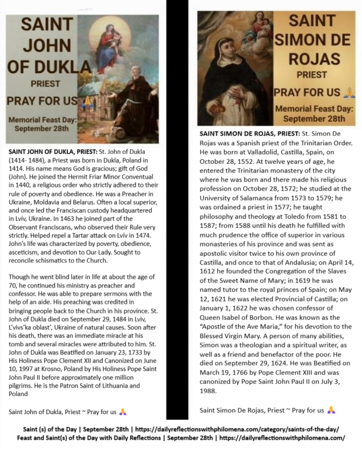 MEMORIAL OF SAINTS LAWRENCE RUIZ AND HIS COMPANIONS, MARTYRS; SAINT WENCESLAUS, MARTYR; SAINT JOHN OF DUKLA, PRIEST; AND SAINT SIMON DE ROJAS, PRIEST ~ FEAST DAY: SEPTEMBER 28TH: Today, the Church honors a diverse group of holy men who, in different ways, bore witness to Christ: Saint Lawrence Ruiz and his Companions, Martyrs (the first canonized Filipino saint and his fellow martyrs, who died in Japan for the faith); Saint Wenceslaus, Martyr (the young Duke of Bohemia and patron of the Czech Republic, who upheld the Catholic faith against great opposition); Saint John of Dukla, Priest (a Polish Franciscan known for his poverty, obedience, and perseverance, even in blindness); and Saint Simon de Rojas, Priest (the Spanish “Apostle of the Ave Maria,” devoted to Our Lady and the poor). Through their intercession, we pray today for the sick and the dying, especially those suffering from cancer, neurological disorders, or other terminal illnesses. We lift up widows and widowers, the poor and needy, and the souls in Purgatory. We pray for peace, love, and unity in our families and in our world. We entrust the Holy Father, bishops, priests, and religious to the Lord, asking for more vocations, the perseverance of persecuted Christians, and the conversion of sinners. May the witness of these saints strengthen our faith and remind us that holiness can be lived in martyrdom, leadership, religious life, and humble service. Amen🙏🏾