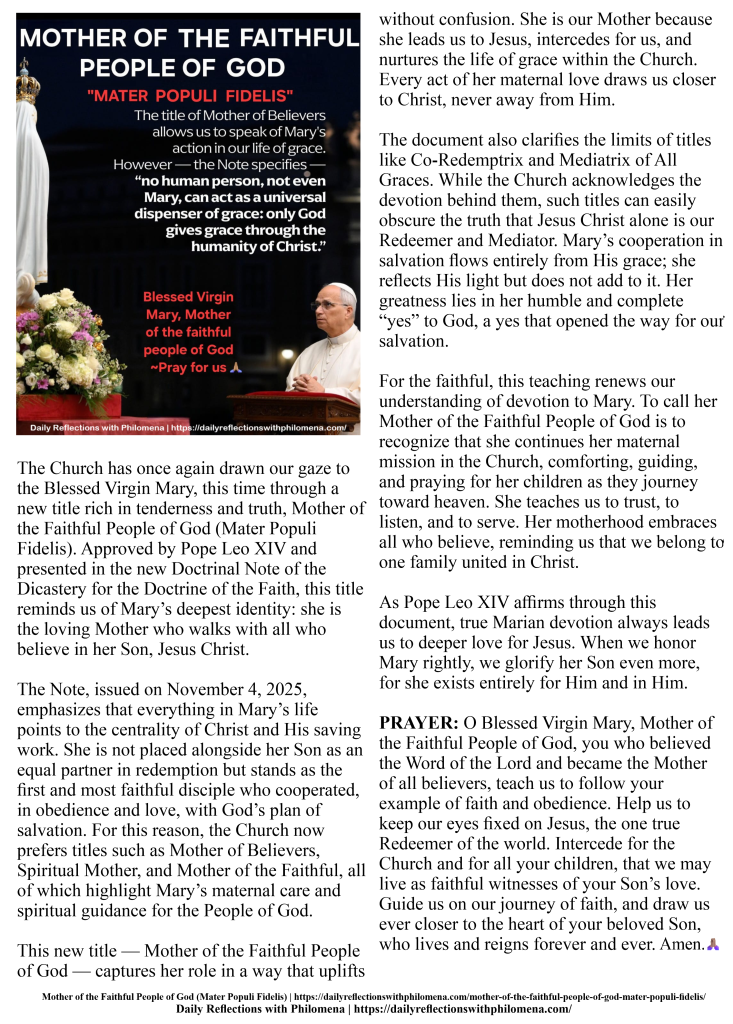 PRAYER: O Blessed Virgin Mary, Mother of the Faithful People of God, you who believed the Word of the Lord and became the Mother of all believers, teach us to follow your example of faith and obedience. Help us to keep our eyes fixed on Jesus, the one true Redeemer of the world. Intercede for the Church and for all your children, that we may live as faithful witnesses of your Son’s love. Guide us on our journey of faith, and draw us ever closer to the heart of your beloved Son, who lives and reigns forever and ever. Amen. 🙏🏽