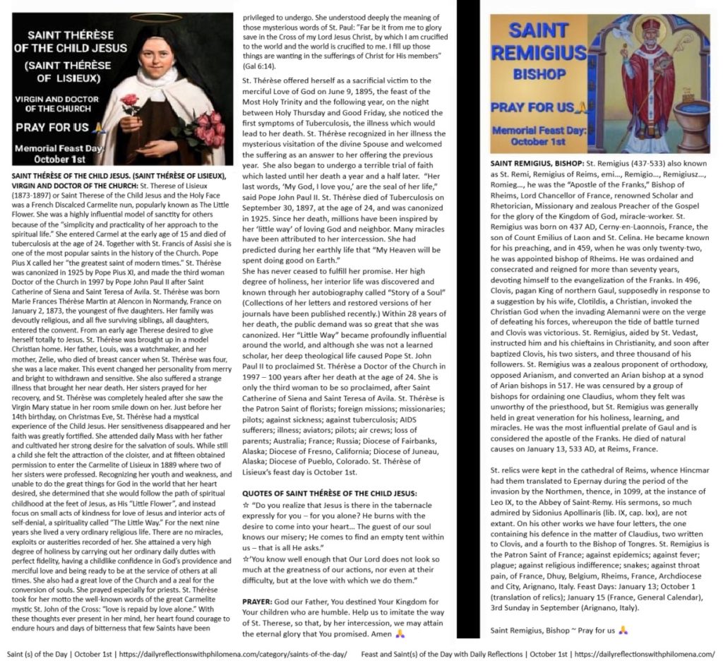 MEMORIAL OF SAINT THÉRÈSE OF THE CHILD JESUS (SAINT THÉRÈSE OF LISIEUX), VIRGIN AND DOCTOR OF THE CHURCH AND SAINT REMIGIUS, BISHOP – FEAST DAY ~ OCTOBER 1ST: Today, we celebrate the Memorial of Saint Thérèse of the Child Jesus (St. Thérèse of Lisieux), Virgin and Doctor of the Church and Saint Remigius, Bishop. Through the intercession of our Blessed Mother Mary and the Saints on this feast day, we humbly pray for the safety and well-being of all missionaries, pilots and all travelers. We pray for the sick and dying, especially those who are sick with the coronavirus, mental illness, HIV/AIDS, tuberculosis, throat diseases and those suffering from cancers and other terminal diseases. We pray for the souls in Purgatory and the repose of the souls of the faithful departed. We pray for all widows and widowers. We pray for the poor and needy, for peace, love, and unity in our marriages, our families and our world. And we continue to pray for our Holy Father, Pope Leo XIV the Bishops, the Clergy, for vocations to the priesthood and religious life, for the Church, for persecuted christians, for the conversion of sinners, and Christians all over the world… Amen🙏