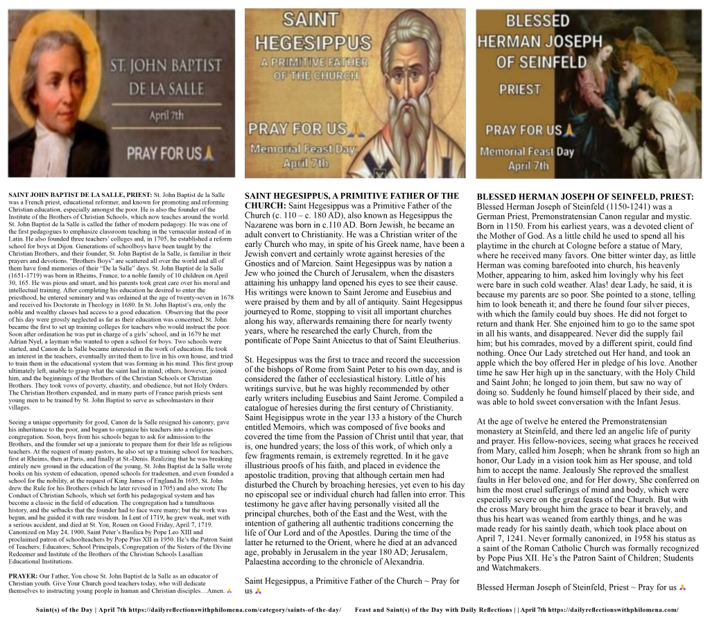 MEMORIAL OF SAINT JOHN BAPTIST DE LA SALLE, PRIEST; SAINT HEGESIPPUS, A PRIMITIVE FATHER OF THE CHURCH AND BLESSED HERMAN JOSEPH OF SEINFELD, PRIEST – FEAST DAY: APRIL 7TH: Today, we celebrate the Memorial of Saint John Baptist de la Salle, Priest (He’s a Patron Saint of Teachers; Educators; School Principals, Congregation of the Sisters of the Divine Redeemer and Institute of the Brothers of the Christian Schools Lasallian Educational Institutions.); Saint Hegesippus was a Primitive Father of the Church and Blessed Herman Joseph of Steinfeld, Priest (Patron Saint of Children; Students and Watchmakers). Through the intercession of our Blessed Mother Mary and the Saints on this feast day, we pray for all teachers, students and all children, we pray for their safety and well-being, especially during these incredibly challenging times.