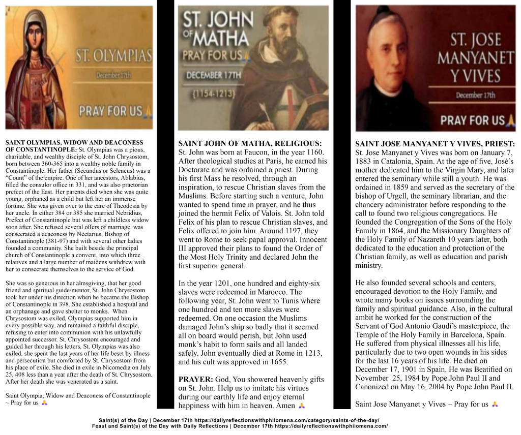MEMORIAL OF SAINT OLYMPIAS, WIDOW AND DEACONESS OF CONSTANTINOPLE; SAINT JOHN OF MATHA, RELIGIOUS AND SAINT JOSE MANYANET Y VIVES, PRIEST – FEAST DAY: DECEMBER 17TH: Today, we celebrate the Memorial of Saint Olympia of Constantinople, Widow and Deaconess; Saint John of Matha, Religious and Saint Jose Manyanet y Vives, Priest.