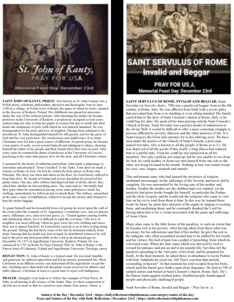 MEMORIAL OF SAINT JOHN OF KANTY, PRIEST AND SAINT SERVULUS OF ROME, INVALID AND BEGGAR – FEAST DAY ~ DECEMBER 23RD: Today, we celebrate the Memorial of Saint John of Kanty, Priest and Saint Servulus of Rome, Invalid and Beggar.