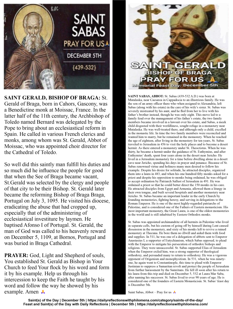 MEMORIAL OF SAINT GERALD, BISHOP OF BRAGA AND SAINT SABAS, ABBOT ~ FEAST DAY ~ DECEMBER 5TH: Today, we celebrate the Memorial of Saint Gerald, Bishop of Braga and Saint Sabas, Abbot. Through the intercession of our Blessed Mother Mary and all the Saints during this special season of Advent, we humbly pray for God’s grace and mercy as we prepare for the coming of Our Lord Jesus Christ. Praying for hope, faith, love, joy and peace in our world today, as we face these incredibly challenging times. We pray for God’s deliverance from impossible causes or situations. We pray for the sick and dying, especially sick children, those who are mentally and physically ill, strokes, heart diseases, and those suffering from cancers and other terminal diseases. We pray for the souls in Purgatory and the repose of the souls of the faithful departed and we pray for all widows and widowers. We pray for torture victims, the poor, the needy and the most vulnerable in our communities and around the world. We pray for all parents and children, for peace, love, justice and unity in our marriages, our families and our world. And we continue to pray for our Holy Father, Pope Leo XIV, the Bishops, the Clergy, for vocations to the priesthood and religious life, for the Church, for persecuted Christians, for the conversion of sinners, and Christians all over the world… Amen🙏