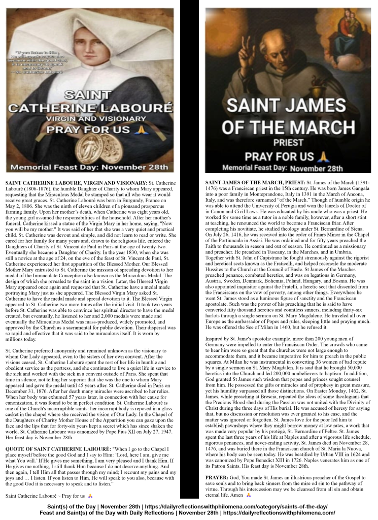 MEMORIAL OF SAINT CATHERINE LABOURÉ, VIRGIN AND VISIONARY AND SAINT JAMES OF THE MARCH, PRIEST – FEAST DAY ~ NOVEMBER 28TH: Today, we celebrate the Memorial of Saint Catherine Labouré, Virgin, Visionary and Saint James of the March, Priest. Through the intercession of our Blessed Mother Mary and all the Saints as we come to the end of this liturgical year, we humbly pray for God’s grace and mercy as we prepare for the coming of Our Lord Jesus Christ. Praying for hope, faith, love, joy and peace in our world today, as we face these incredibly challenging times. We pray for God’s deliverance from impossible causes or situations. We pray for the sick and dying, especially sick children, those who are mentally and physically ill, strokes, heart diseases, and those suffering from cancers and other terminal diseases. We pray for the souls in Purgatory and the repose of the souls of the faithful departed and we pray for all widows and widowers. We pray for torture victims, the poor, the needy and the most vulnerable in our communities and around the world. We pray for all parents and children, for peace, love, justice and unity in our marriages, our families and our world. And we continue to pray for our Holy Father, the Bishops, the Clergy, for vocations to the priesthood and religious life, for the Church, for persecuted christians, for the conversion of sinners, and Christians all over the world… Amen🙏