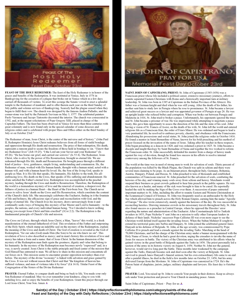 FEAST OF THE HOLY REDEEMER AND THE MEMORIAL OF SAINT JOHN OF CAPISTRANO, PRIEST ~ FEAST DAY ~ OCTOBER 23RD: Today, we celebrate the Feast of the Holy Redeemer and the Memorial of Saint John of Capistrano, Priest. Through the intercession of our Blessed Mother Mary and the Saints on this feast day, we humbly pray for God’s Divine Grace and Mercy upon us all. We pray for peace, love, justice and unity in our marriages, our families and our world. We pray for the poor, the needy and the most vulnerable. We pray for the sick and dying, especially those who are mentally and physically ill, and those suffering from cancers and other terminal diseases. We pray for the souls in Purgatory and the repose of the souls of the faithful departed. We pray for all widows and widowers. And we continue to pray for our Holy Father, the Bishops, the Clergy, for vocations to the priesthood and religious life, for the Church, for persecuted christians, for the conversion of sinners, and Christians all over the world…. Amen🙏
