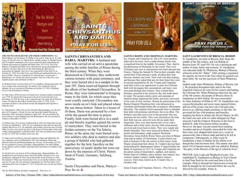 MEMORIAL OF THE SIX WELSH MARTYRS AND THEIR COMPANIONS; SAINTS CHRYSANTHUS AND DARIA; SAINTS CRISPIN AND CRISPINIAN AND SAINT GAUDENTIUS OF BRESCIA, BISHOP ~ FEAST DAY ~ OCTOBER 25TH: Today, we celebrate the Memorial of the Six Welsh Martyrs and their Companions; Saints Chrysanthus and Daria; Saint Crispin and Crispinian and St. Gaudentius of Brescia, Bishop. Through the intercession of our Blessed Mother Mary and the Saints on this feast day, we humbly pray for God’s Divine Grace and Mercy upon us all. We pray for shoemakers, cobblers and all workers. We pray for the poor, the needy and the most vulnerable in our communities and around the world. We pray for peace, love, justice and unity in our marriages, our families and our world. We pray for the sick and dying, especially those who are mentally and physically ill and those suffering from cancers and other terminal diseases. We pray for the souls in Purgatory and the repose of the souls of the faithful departed. We pray for all widows and widowers. And we continue to pray for our Holy Father, the Bishops, the Clergy, for vocations to the priesthood and religious life, for the Church, for persecuted christians, for the conversion of sinners, and Christians all over the world…. Amen🙏