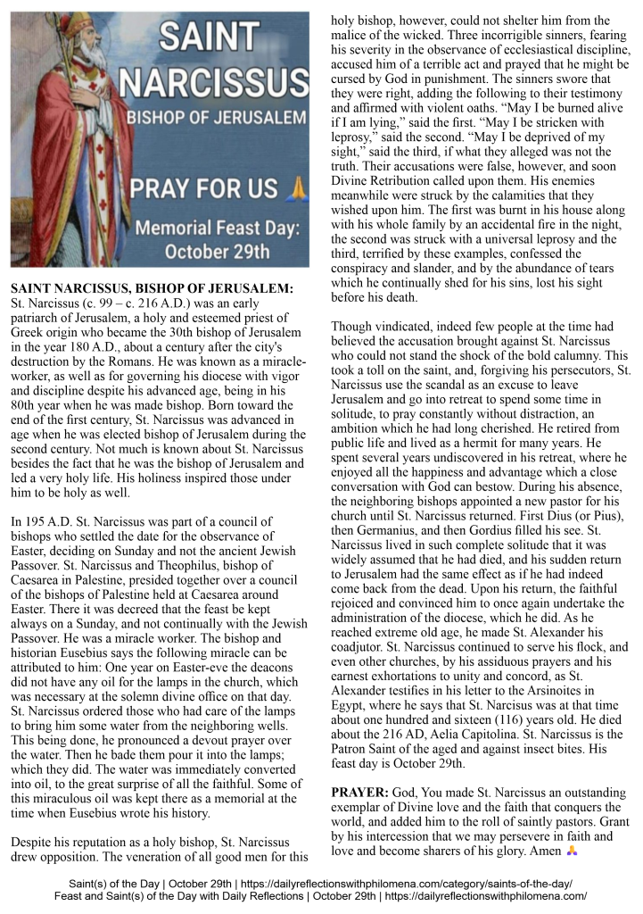 MEMORIAL OF SAINT NARCISSUS, BISHOP OF JERUSALEM – FEAST DAY ~ OCTOBER 29TH: Today, we celebrate the Memorial of Saint Narcissus, Bishop of Jerusalem. Through the intercession of our Blessed Mother Mary and the Saints on this feast day, we humbly pray for God’s Divine Grace and Mercy upon us all. We pray for the poor, the needy and the most vulnerable in our communities and around the world. We pray for peace, love, justice and unity in our marriages, our families and our world. We pray for the aged, the sick and dying, especially those who are mentally and physically ill, those suffering from cancers and other terminal diseases. We pray for the souls in Purgatory and the repose of the souls of the faithful departed. We pray for all widows and widowers. And we continue to pray for our Holy Father, the Bishops, the Clergy, for vocations to the priesthood and religious life, for the Church, for persecuted christians, for the conversion of sinners, and Christians all over the world…. Amen🙏