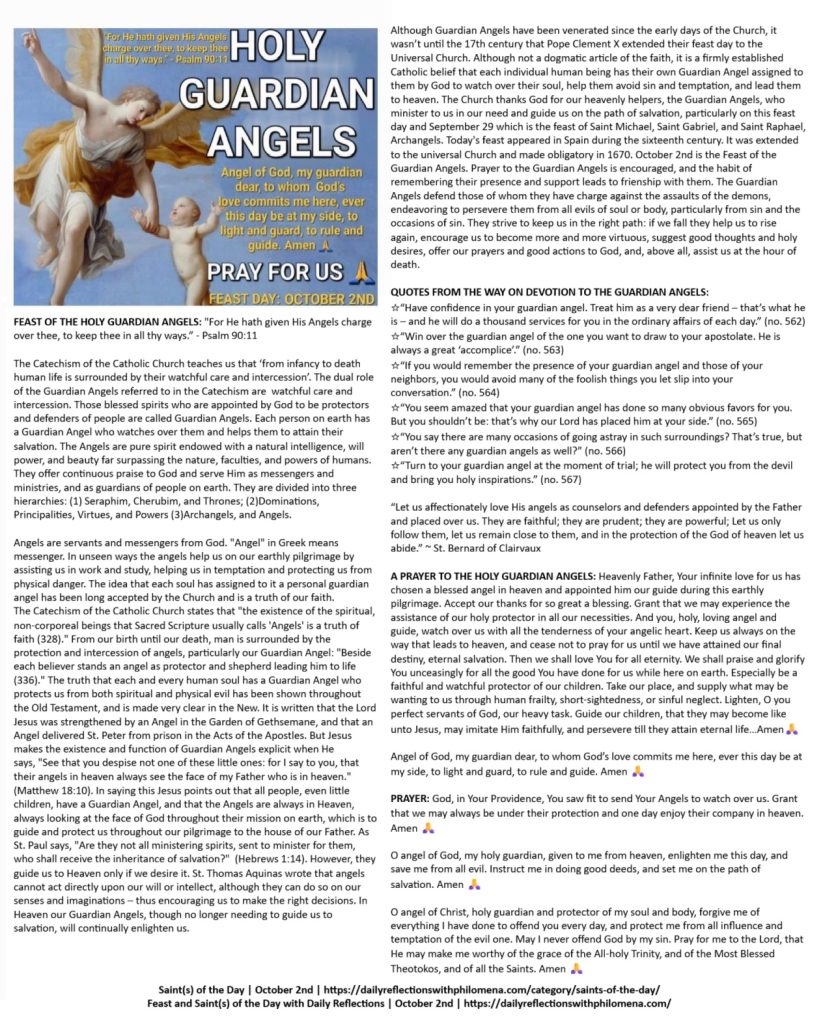 MEMORIAL OF THE HOLY GUARDIAN ANGELS – FEAST DAY ~ OCTOBER 2ND: Today, we celebrate the Feast of the Holy Guardian Angels. Through the intercession of our Blessed Mother Mary and the Holy Guardian Angels on this feast day, we humbly pray for God’s guidance and protection upon us all. We pray for the sick and dying, especially those who are mentally and physically ill and those suffering from cancers and other terminal diseases. We pray for the souls in Purgatory and the repose of the souls of the faithful departed. We pray for all widows and widowers. We pray for the poor and needy, for peace, love, and unity in our marriages, our families and our world. And we continue to pray for our Holy Father, Pope Leo XIV, the Bishops, the Clergy, for vocations to the priesthood and religious life, for the Church, for persecuted christians, for the conversion of sinners, and Christians all over the world…. Amen🙏