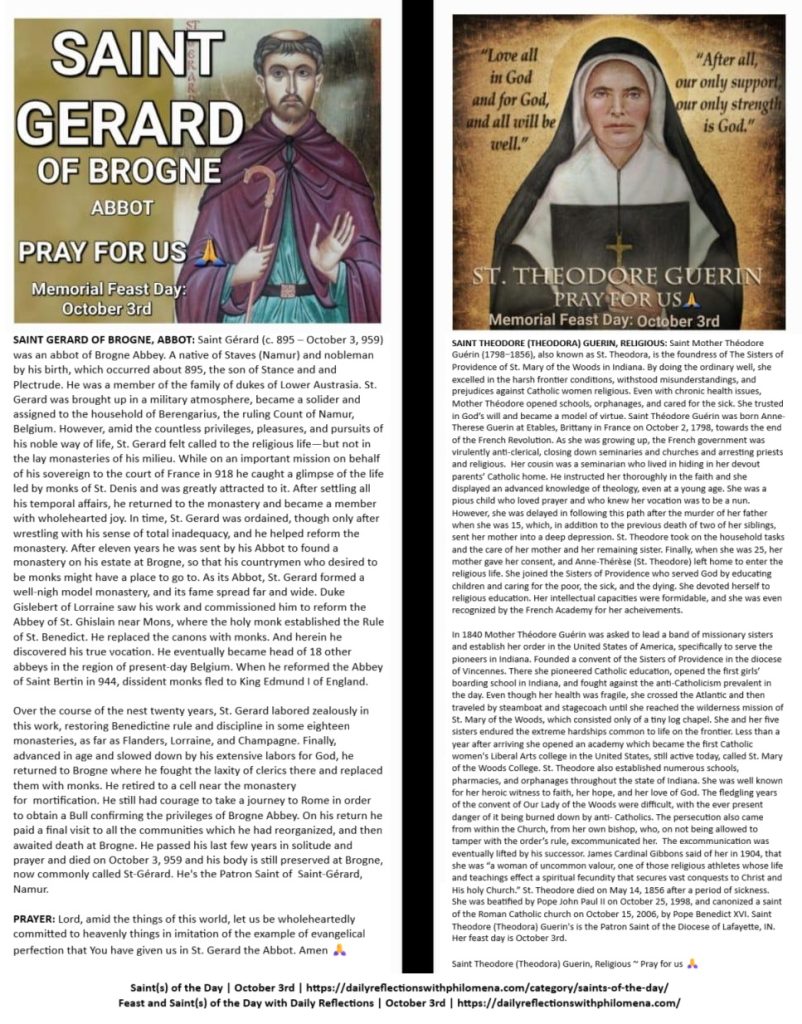 MEMORIAL OF SAINT GERARD OF BROGNE, ABBOT AND SAINT THEODORE (THEODORA) GUERIN, RELIGIOUS: Today, we celebrate the Memorial of Saint Gerard of Brogne, Abbot and Saint Theodore (Theodora) Guerin, Religious. Through the intercession of our Blessed Mother Mary and the Saints on this feast day, we humbly pray for all marriages, for peace, love, and unity in our marriages, our families, and our world. We pray for the sick and dying, especially those who are mentally and physically ill and those suffering from cancers and other terminal diseases. We pray for the souls in Purgatory and the repose of the souls of the faithful departed. We pray for all widows and widowers. We pray for the poor, needy, and the most vulnerable. And we continue to pray for our Holy Father, Pope Leo XIV, the Bishops, the Clergy, for vocations to the priesthood and religious life, for the Church, for persecuted Christians, for the conversion of sinners, and Christians all over the world…. Amen🙏