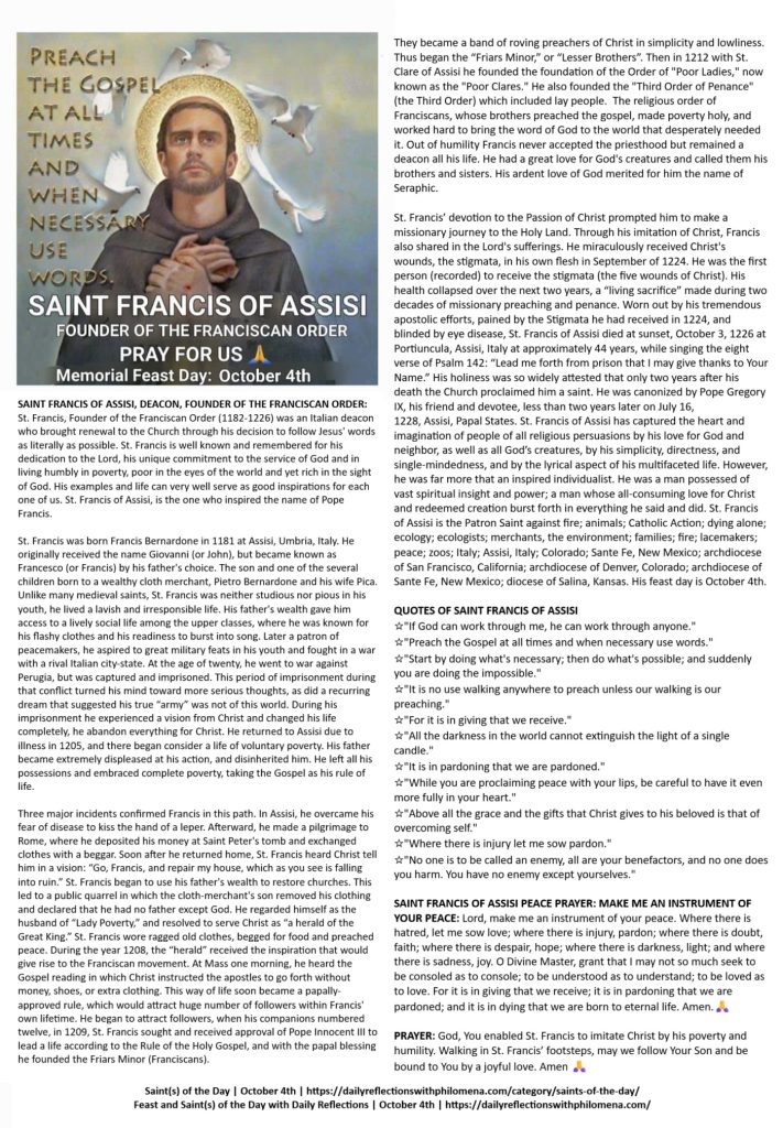 MEMORIAL OF SAINT FRANCIS OF ASSISI, DEACON, FOUNDER OF THE FRANCISCAN ORDER – FEAST DAY ~ OCTOBER 4TH: Today, we celebrate the Memorial of Saint Francis of Assisi, Deacon, Founder of the Franciscan Order. Through the intercession of our Blessed Mother Mary and the Saints on this feast day, we humbly pray for God’s Divine Grace and Mercy. We pray for the sick and dying, especially those who are mentally and physically ill and those suffering from cancers and other terminal diseases. We pray for the souls in Purgatory and the repose of the souls of the faithful departed. We pray for all widows and widowers. We pray for the poor and needy, for peace, love, and unity in our marriages, our families, and our world. And we continue to pray for our Holy Father, Pope Leo XIV, the Bishops, the Clergy, for vocations to the priesthood and religious life, for the Church, for persecuted Christians, for the conversion of sinners, and Christians all over the world…. Amen🙏
