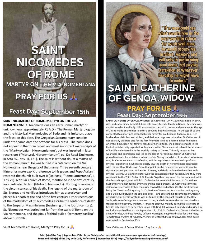 OTHER SAINTS OF THE DAY: SAINT NICOMEDES OF ROME, MARTYR ON THE VIA NOMENTANA AND ST CATHERINE OF GENOA, WIDOW – FEAST DAY~ SEPTEMBER 15TH