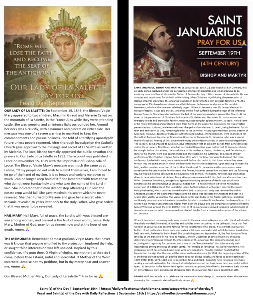 FEAST OF OUR LADY OF LA SALETTE; MEMORIAL OF SAINT JANUARIUS, BISHOP AND MARTYR ~ FEAST DAY ~ SEPTEMBER 19TH: Today, we celebrate the Feast of Our Lady of La Salette and the Memorial of Saint Januarius, Bishop and Martyr. Through the intercession of our Blessed Mother Mary and the Saint Januarius on this feast day, we humbly pray against natural disasters. We pray for the sick and dying, especially those who are mentally and physically ill, and those suffering from cancers and other terminal diseases. We pray for the souls in Purgatory and the repose of the souls of the faithful departed. We pray for the poor and needy, for all widows and widowers, for peace, love, and unity in our marriages, our families and our world. And we continue to pray for our Holy Father, Pope Francis, the Bishops, the Clergy, for vocations to the priesthood and religious life, for the Church, for persecuted christians, for the conversion of sinners, and Christians all over the world…. Amen🙏