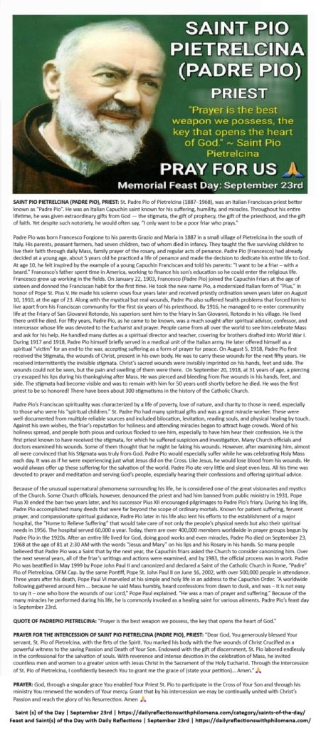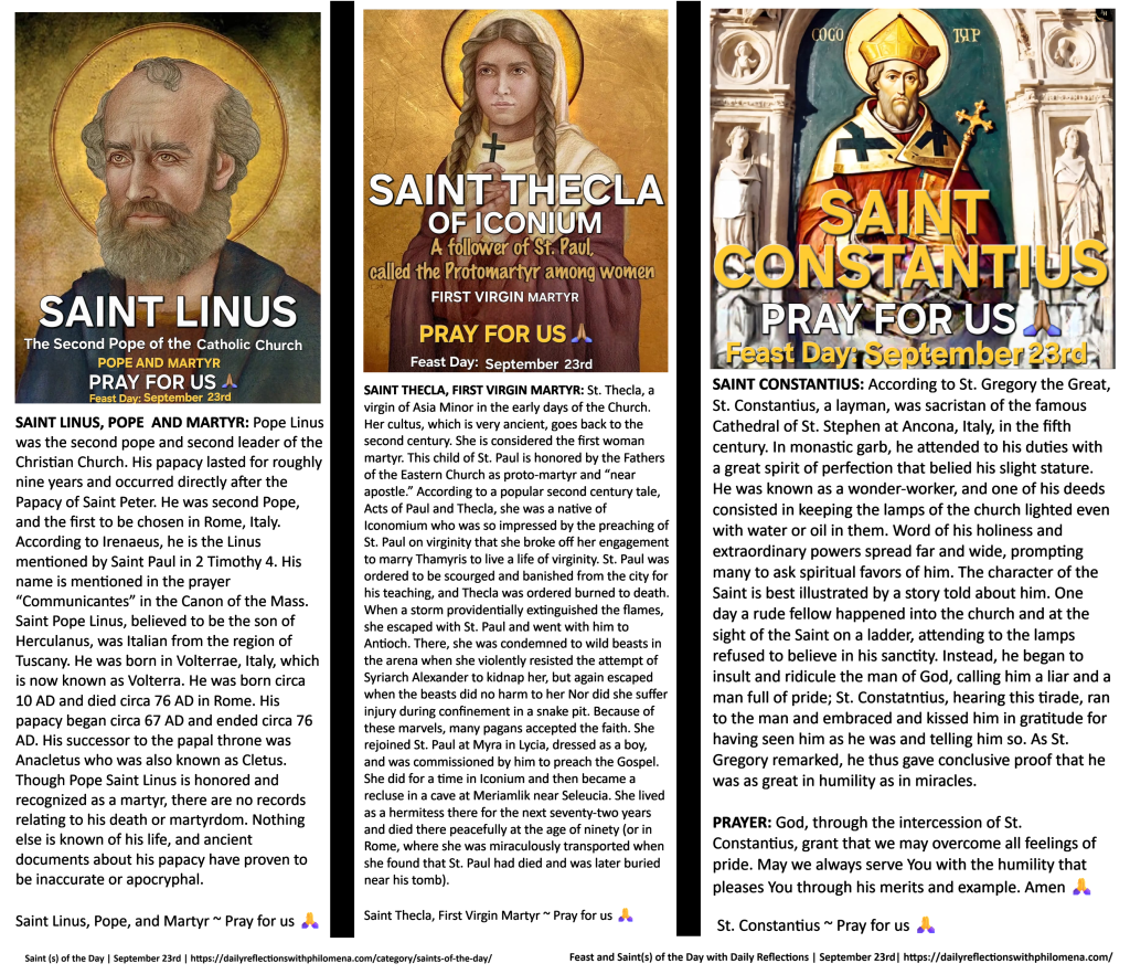 MEMORIAL OF SAINT PIO OF PIETRELCINA (PADRE PIO), PRIEST; SAINT LINUS, POPE AND MARTYR; SAINT THECLA, FIRST VIRGIN MARTYR AND SAINT CONSTANTIUS: Today, we celebrate the Memorial of Saint Pio of Pietrelcina (Padre Pio), Priest; Saint Linus Pope and martyr; Saint Thecla, First Virgin Martyr and Saint Constantius Through the intercession of our Blessed Mother Mary and the Saints on this feast day, we humbly pray for the sick and dying, especially those who are mentally and physically ill and those suffering from cancers and other terminal diseases. We pray for the souls in Purgatory and the repose of the souls of the faithful departed. We pray for all widows and widowers. We pray for the poor and needy, for peace, love, and unity in our marriages, our families, and our world. And we continue to pray for our Holy Father, the Bishops, the Clergy, for vocations to the priesthood and religious life, for the Church, for persecuted christians, for the conversion of sinners, and Christians all over the world…. Amen🙏