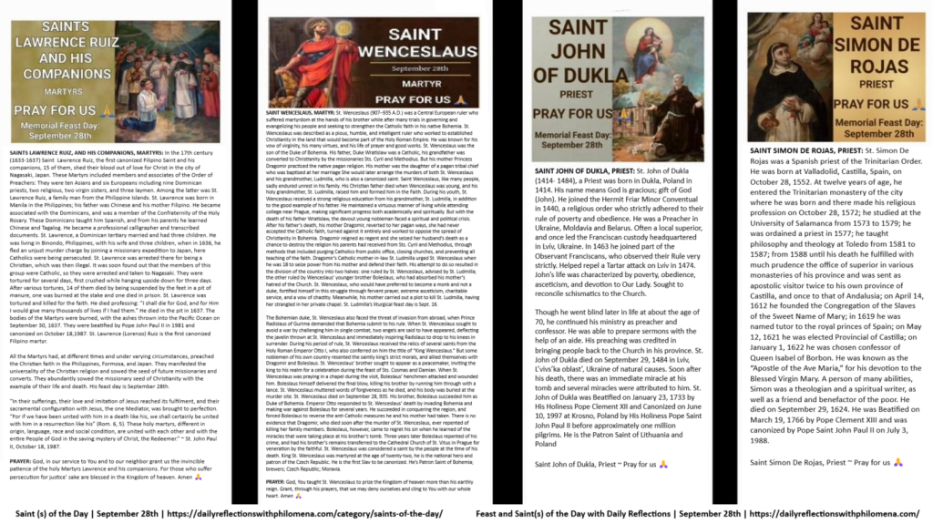MEMORIAL OF SAINTS LAWRENCE RUIZ, AND HIS COMPANIONS, MARTYRS; SAINT WENCESLAUS, MARTYR; SAINT JOHN OF DUKLA AND SAINT SIMON DE ROJAS, PRIEST ~ FEAST DAY ~ SEPTEMBER 28TH: Today, we celebrate the Memorial of Saints Lawrence Ruiz, and His Companions, Martyrs; Saint Wenceslaus, Martyr; Saint John of Dukla, Priest and Saint Simón de Rojas, Priest. Through the intercession of our Blessed Mother Mary and the Saints on this feast day, we humbly pray for the sick and dying, especially those who are mentally and physically ill and those suffering from cancers and other terminal diseases. We pray for the souls in Purgatory and the repose of the souls of the faithful departed. We pray for all widows and widowers. We pray for the poor and needy, for peace, love, and unity in our marriages, our families and our world. And we continue to pray for our Holy Father, the Bishops, the Clergy, for vocations to the priesthood and religious life, for the Church, for persecuted Christians, for the conversion of sinners, and Christians all over the world…. Amen🙏
