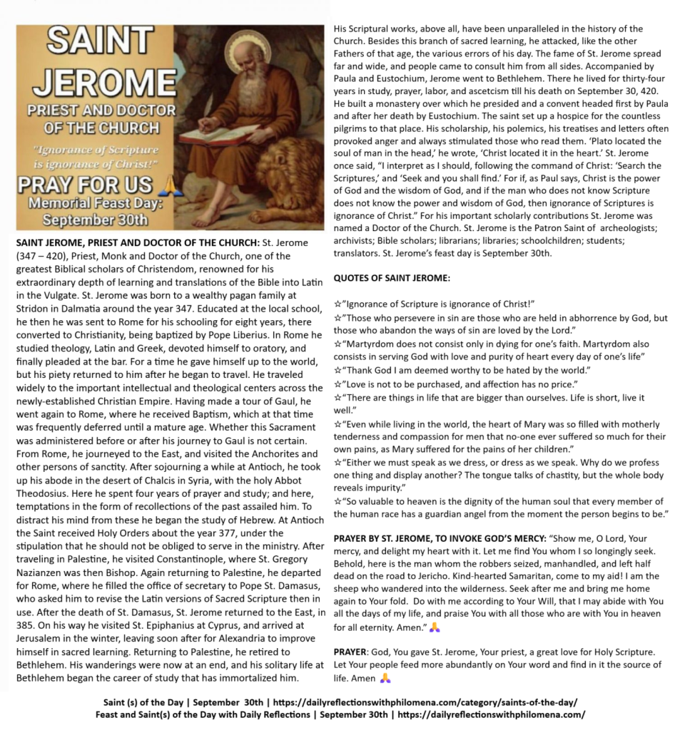 MEMORIAL OF SAINT JEROME, PRIEST AND DOCTOR OF THE CHURCH: Today, we celebrate the Memorial of Saint Jerome, Priest and Doctor of the Church. Through the intercession of our Blessed Mother Mary and Saint Jerome on this feast day, we humbly pray for the safety and well-being of our children, we pray for all students, teachers, librarians, Bible Scholars and all those who proclaim the Gospel. We pray for the sick and dying, especially those who are sick mentally and physically ill and those suffering from cancers and other terminal diseases. We pray for the souls in Purgatory and the repose of the souls of the faithful departed. We pray for all widows and widowers. We pray for the poor and needy, for peace, love, and unity in our marriages, our families and our world. And we continue to pray for our Holy Father, the Bishops, the Clergy, for vocations to the priesthood and religious life, for the Church, for persecuted christians, for the conversion of sinners, and Christians all over the world… Amen🙏