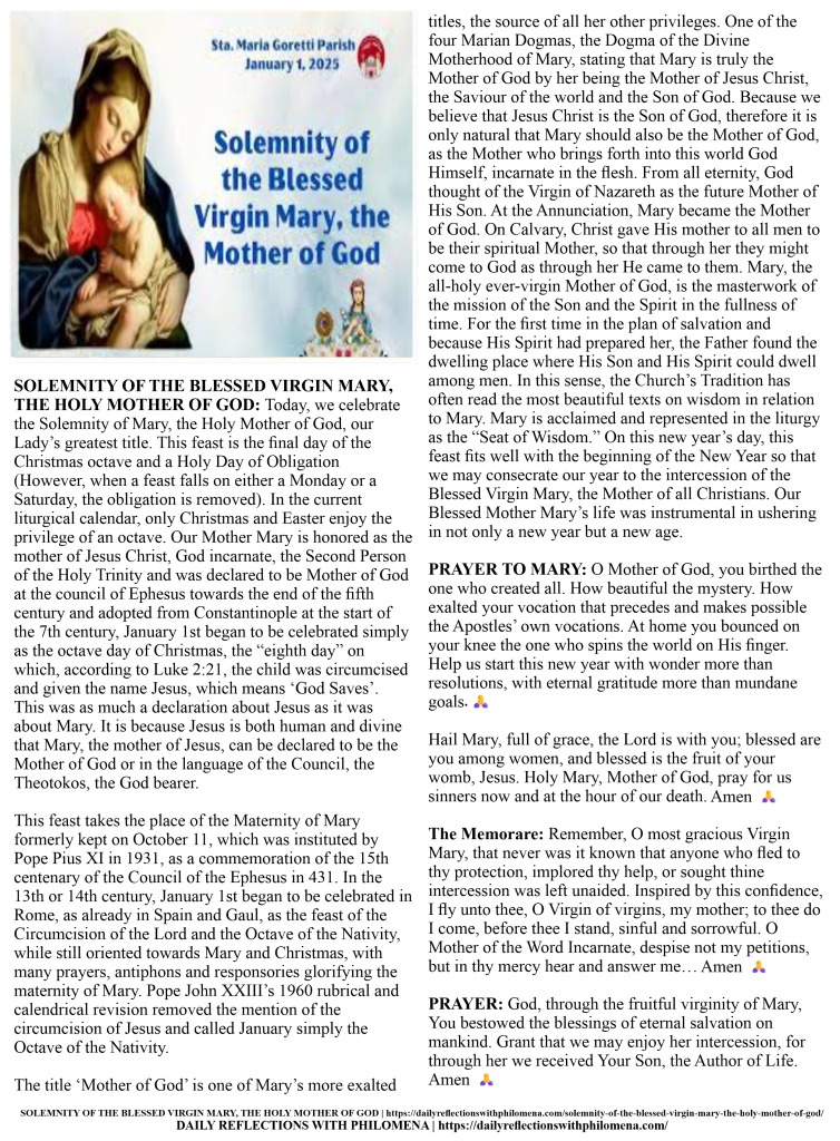 SOLEMNITY OF THE BLESSED VIRGIN MARY, THE HOLY MOTHER OF GOD | https://dailyreflectionswithphilomena.com/solemnity-of-the-blessed-virgin-mary-the-holy-mother-of-god/