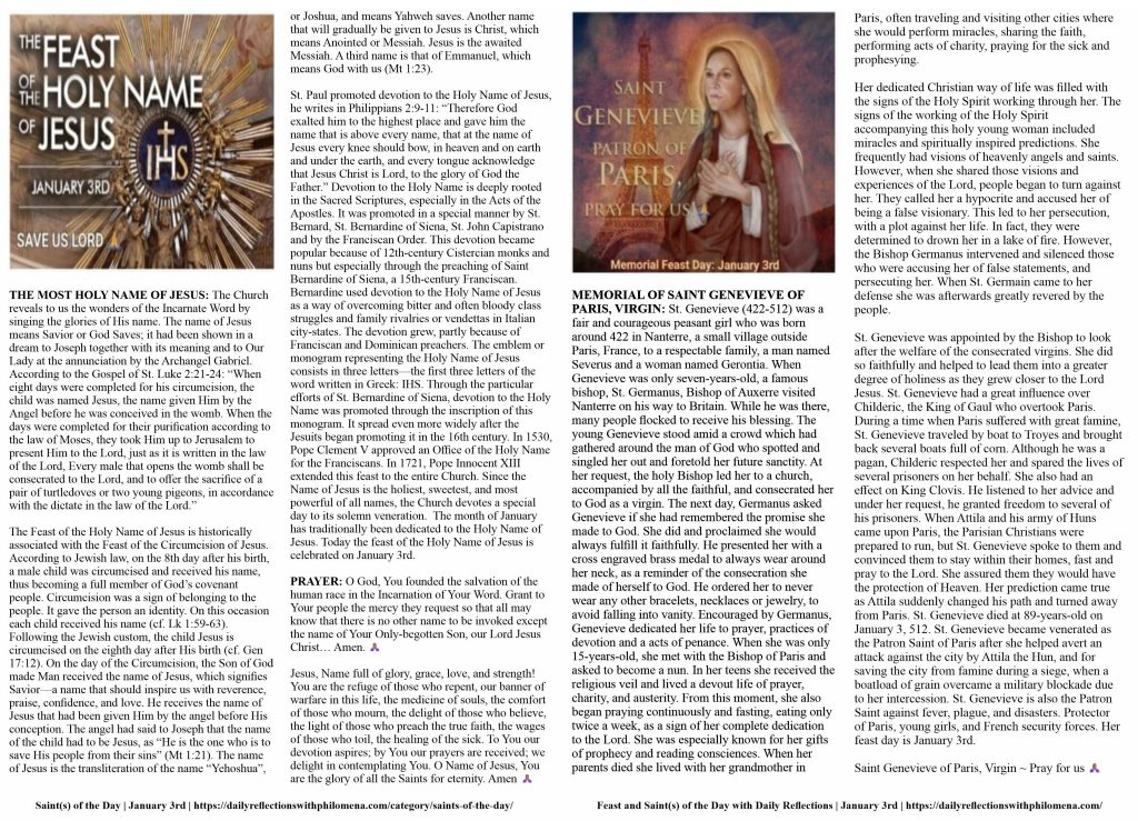 (Direct link to the detailed history of the Feast of the Most Holy Name of Jesus and Saint Genevieve of Paris | https://dailyreflectionswithphilomena.com/saints-of-the-day-feast-day-january-3rd/)