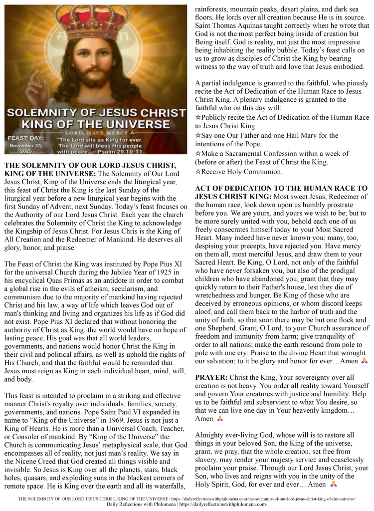 THE SOLEMNITY OF OUR LORD JESUS CHRIST, KING OF THE UNIVERSE | https://dailyreflectionswithphilomena.com/the-solemnity-of-our-lord-jesus-christ-king-of-the-universe/